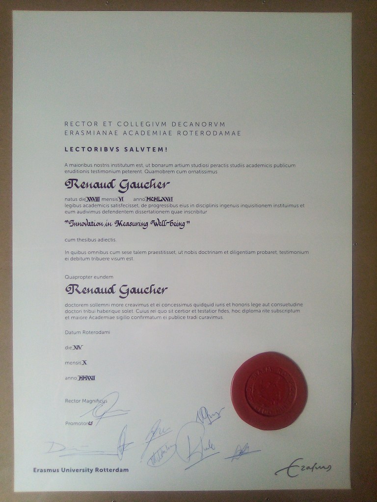 Comme j’ai fait mon doctorat avec une professeure de psychologie, un professeur d’économie et un professeur de sociologie, j’ai demandé dans quel domaine je pouvais dire que j’ai fait mon doctorat et il m’a été répondu « happiness studies », ce que j’ai traduit par science du bonheur.